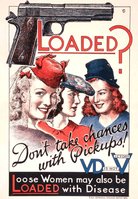 II. Dünya Savaşı dönemine ait bu afiş, zührevi hastalıklara karşı kadınları “hastalık taşıyıcılar” olarak hedef alıyor. Sağlık mesajından çok, damgalayıcı bir içerik taşıyor.