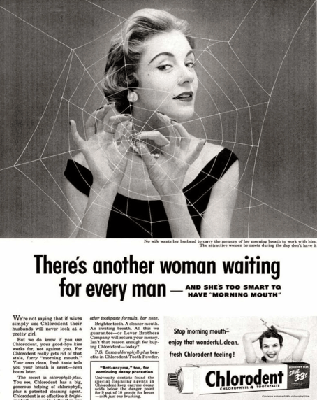 Chlorodent diş macunu reklamı, sabah ağız kokusundan kaçınmazsanız kocanızın “başka kadınlara” yöneleceğini ima ediyor.