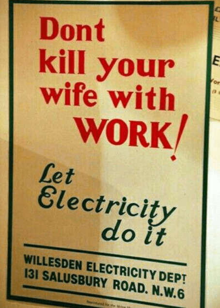 Bu afiş, elektrikle yapılan işleri teşvik etmek için “eşinizi iş yüküyle öldürmeyin” diyor ve cinsiyet rollerini komik bir şekilde yansıtıyor.