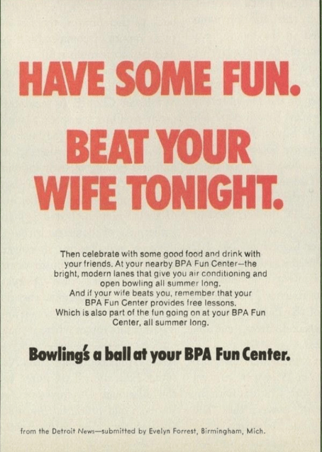 Bu bowling merkezi reklamında kullanılan “Bu Akşam Eşinizi Yenin” sloganı, zararlı bir kavramı rekabetçi bir şaka olarak sunuyor.