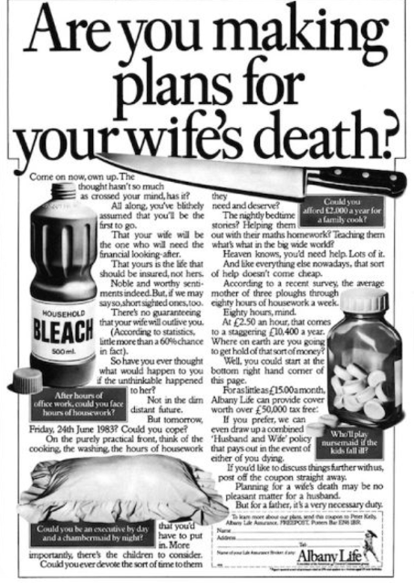 Albany Life’ın bu reklamı, şok edici bir ifadeyle erkekleri eşlerinin ölümü için finansal plan yapmaya çağırıyor. Kadını yalnızca ev işleri ve çocuk bakımı masraflarına indirgemesi, tam anlamıyla absürt.