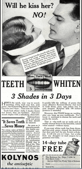 Prof. Bird’s Cream of Almonds ürününü tanıtan bu reklam, sivilceleri ve cilt pürüzlerini yok edeceğini iddia ederek güzellik standartlarını sömürmekte.