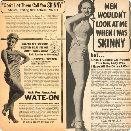 Bu reklam, “Wate-On” adlı ürünü tanıtarak ince kadınları utandırıyor ve erkeklerin kıvrımlı kadınları tercih ettiğini öne sürüyor. Dönemin zararlı beden algısı standartlarını yansıtıyor.