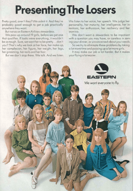 Eastern Airlines’ın bu reklamı, hostes seçiminde görünüş, kişilik ve davranış gibi kriterleri vurguluyor. Eski dönem reklamcılığın cinsiyetçi tonuna mükemmel bir örnek.